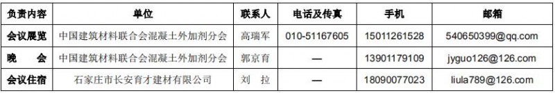 3. 為活躍行業交流,本次會議為企業提供了專門的宣傳場地,即在與大會同期舉辦第八屆中國混凝土外加劑產品及設備展示會,會議所有宣傳活動集中在展示會會場。有宣傳意向的企業請與分會秘書處高瑞軍聯系。